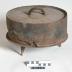 Description : Récipient sur plan ovale à bords moyens droits. Fond plat à trois pieds de section triangulaire. Couvercle s'emboîtant jusqu'à la base du récipient avec une anse centrale.