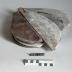 1992_1753_8 : Plaque en bois recouverte sur une face d'un tôle (H : 11 cm L : 32 cm ép : 0,9 cm). La couverture n'est pas totale, on voit apparaître le bois tout le long de l'arrête rectiligne. Sur l'autre face, la tôle déborde d'environ 0,5 cm. La tôle et la planchette sont rendues solidaires par trois clous qui les traversent et qui sont rabattus sur la planche. L'état est médiocre.