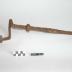 Description : Axe de section carrée au mileu (à l'emplacement de la fixation de la meule) cylindrique aux extrémités. Une extrémité porte une manivelle à branche en 1/2 cercle et un bouton rond de D : 33 cm.
