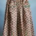 Description : Jupe en tissu provençal faite à la main et à la machine à coudre. Tissu de couleur jaune clair avec des motifs jaune, rouge, mauve, vert. Jupe froncée à la taille avec une bordure verte au-dessus de la taille et à la base des vêtements. Le bas de la jupe à une doublure verte de 20 cm surpiquée à la machine. Deux poches avec revers bâtis comme le bas de la robe.