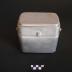 Description : Boîte rectangulaire à deux compartiments avec une anse tombante et un couvercle qui peut servir de récipient. Il est munin d'une queue qui sert à la fois à le tenir et à le fixer sur la boîte.