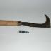 Description : Fer large, recourbé, aiguisé à soie noyée fixée au bout d'un manche à virole. D'un côté opposé au tranchant, fer aiguisé en forme de fer de hachette.