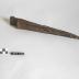 Description : Pièce métallique comprenant à une extrémité une pointe à quatre pans et à l'autre une panne à un épaulement. Au centre se trouve un trou ovale dans lequel passaient les volutes.