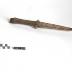 Description : Pièce métallique comprenant à une extrémité une pointe à quatre pans et à l'autre une panne à un épaulement. Au centre se trouve un trou ovale dans lequel passe un anneau ovale légèrement ouvert de section rectangulaire.