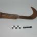 Description : Lame en arc de cercle, à soie noyée se recourbant à son extrémité. Le manche en bois cylindrique est évasé à son extrémité. Présence d'un repose doigt à proximité de la lame.
