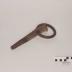 Description : Forme effilée à plat, tête rectangulaire martelée. le coin est percé dans sa partie supérieure d'un trou circulaire ( D : 2,3 cm) cerclé sur les deux faces. Un anneau mobile, fermé et ovale passe dans le trou.