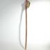 Description : Tige effilée aux deux extrémités. Elle est renflée à son sommet. La tige est incisée en quatre pans. Elle est munie de deux rondelles de bois à quatre gorges en haut et en bas, ainsi qu'une tige verticale de bois qui maintient l'écartement des fourches et par conséquent la stabilité des rondelles. La tige est sertie de part et d'autre des fourches par du fil de fer. Une bande de tissu brodée (marron et sable (L 47 cm)) est accrochée à l'une des fourches.