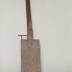 Description : Fer de forme rectangulaire (L : 34 cm, Lg : 16 cm). Lame en arc de cercle. Il est légèrement concave. Une nervure en "V" près du manche renforce la lame. Le fer se rattache au manche par deux languettes de métal qui se détachent de la tête. Elles sont rivetées en un point. Un appui pied (estrieu) est détaché du fer et planté dans le manche. Il est relié à un bord du fer par une tige métallique coudée. Il sert d'appui pied et permet de faire pénétrer plus profondément l'outil en terre. Le manche est d'abord de section cylindrique, puis quadrangulaire au niveau des languettes et enfin s'élargit pour prendre la forme d'un "V" s'inscrivant dans le fer.