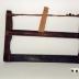 Description : Cadre à sommet médian montée en mortaise. La scie est montée en enfourchement ; tension par petit bois sur corde torsadée. Lame (Lg : 4 cm) à dents obliques (L : 0,1 cm). Rétrécissement des montants verticaux pour former une poignée.