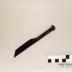 Description : Un "couteau" avec un taillant oblique. Une poignée quadrangulaire chanfreinée. Évasée à la tête du fait d'une martelage intensif. Motif d'écaille sur l'ensemble de la pièce. Il s'agit peut-être de la réutilisation pour forger cette outil d'une vieille lime à fer.