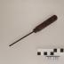 Description : Petite gouge creuse montée sur soie de section rectangulaire noyée. Taillant de la gouge (Lg : 4 mm), Manche octogonale à tête circulaire bombée au sommet. Le manche est serti d'une virole.