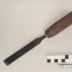 Description : Lame à talon (Lg : 20 mm). La soie noyée avec queue à embase. Le manche est de fabrication domestique. Il est de section rectangulaire aux angles arrondis. La tête est chanfreinée à l'avant et à l'arrière. Le manche est serti par un anneau de cuivre.