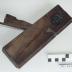 Description : Fût rectangulaire composé de deux pièces assemblées par embrèvement (multiples rainures et languettes), la forme gauche est percée de deux trous aux extrémités destinées éventuellement à suspendre l'outil. La lumière est trapézoïdale, elle est ouverte sur la face latérale droite. Elle est garnie de ses fer et coin.