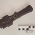 Description : Pièce de métal de section rectangulaire avec une tête évasée afin d'être marteler. Les angles sont chanfreinés. La base de la pièce est de forme quadrangulaire. Elle est sertie par une bague métallique en ovale allongée. Cette pièce est percée de deux crans. Une cheville métallique maintient à la fois la lame et la bague. La lame est composée de quatre éléments. Ces élèments sont maintenus en place par un coin de métal. La lame comprend deux sections semi-circulaires et deux tranchants.