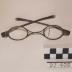 Description : Verre de forme ovale allongée. Le repose nez est relié aux verres par un double empattement. Les verres sont sertis et la monture est vissée. Les branches sont à gonds. Elles sont incurvées pour épouser la forme du crâne. Elles sont percées aux deux extrémités pour passer un fil.