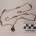 Description : Chaînette à anneaux ovales et striés. Elle est animée par neuf triplets de perles, comprenant une perle ovoïde encadré par des perles sphériques. Une pierre de forme trapézoïdale, de couleur caramel et striée comme un berlingot est monté à un de ses angles sur une couronne de feuille munie d'un anneau circulaire pour se fixer à la chaîne.