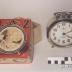 Description : Réveil à cadran à chiffre arabe de 1 à 12. Ces chiffres ont un dessin pour donner un relief oblique à droite. Comme les aiguilles, ils ont été repeint par des rehauts de peinture réfléchissant ocre jaune. Présence de deux aiguilles avec un décor en écaille réfléchissante ocre jaune. Un double cercle gradué marque les minutes avec des traits fins. L'indication des cinq minutes est marqué avec un trait gras. Le cadran est protégé par un verre. Un cadran (D : 2 cm) gradué et marqué sans relief possède une aiguille se tournait dans le sens inverse des aiguilles d'une montre comme la flèche l'indique. Il permet de régler la sonnerie. Le réveil a une forme cylindrique. Il est muni d'une anse en arc surbaissé au sommet ainsi qu'un bouton monté sur le ressort pour stopper la sonnerie, ainsi que trois pieds. Le catalogue Manufrance caractérise ce type de réveil de genre américain. Au dos, se trouve deux remontoirs graduée muni d'un taquet permet en poussant à droite ou à gauche de régler le retard ou l'avance du réveil.
