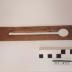 Description : Pièce de bois de section rectangulaire aux bords arrondis. Au centre de cette pièce se trouve une encoche chanfreiné de 15 cm. A une extrémité, elle se termine par un cercle (D : 0,8 cm) à l'autre extrémité par un cercle ouvert (D : 2,5 cm)