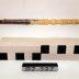 Description : Une douille métallique cylindrique sertie un manche en os. Cette douille, au revers a une encoche au milieu. Son extrémité est, au revers repliée en "V" afin de glisser une plume. A l'avers, la douille est animé d'une décoration. Le stylet en os est animé par une succession de perle. La perle médiane est percée. La tête du stylet est cylindrique sans décoration.