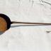 Description : Récipient en métal sur plan ovale, à bords bas (H : 8 cm) évasés, à manche de métal plein de section rectangulaire (L : 100 cm) se terminant par un anneau en forme de larme. Traces de reprise de forge au niveau de l'anneau.
