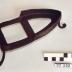 Description : Plaque métallique ajourée, munie d'un rebord, en forme d'arc en lancette. Elle est munie de trois pieds à volute. On remarque des traces de soudure et de découpe du métal.