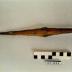Description : Pièce de bois tournée, renflée en son milieu, appointée aux deux extrémités. Elle comprend un embout métallique cranté conique. Il est décoré de stries horizontaux encadrant des stries obliques et croisés. Non retrouvé lors du recollement de novembre 2006.