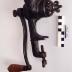 Description : Mécanisme comprenant un entonnoir sur plan ovale. Une vis d'Archimède actionnée par une manivelle coudée en "S" avec une poignée à virole. Sur l'axe autour duquel tourne la vis sont montés les différents couteaux en fonction des besoins. Une vis papillon permet un changement rapide. Le mécanisme est monté sur un bâti à mâchoire permettant de le fixer sur une table. Le serrage se fait au moyen d'une vis papillon.