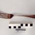 Description : Fourchette à quatre dents avec un manche gravé d'un "X" encadré par des volutes.