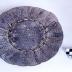 Description : Disque d'aluminium percé de trous (D : 0,2 cm). Il est équipé de deux anses mobiles en fil de fer se crantant dans des encoches en forme de "U" renversé. Tout autour du Disque, des charnières maintiennent des plaques d'aluminium. Elles sont de forme trapézoïdale et légèrement arrondie. Ces plaques se chevauchent sur un de leur côté. Au revers du Disque, un système de trois petits leviers montés sur des lames à ressort entraîne la tension d'un câble. Ce câble tendu maintient dressé à la verticale les plaques trapézoïdales. Ce système étant essentiellement imagé pour un gain de place.