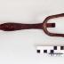 Description : Poignée incurvée concave munie à une extrémité d'une fourche en "U". Au revers de la fourche, au centre se trouvent deux ergots. Une troisième branche est perpendiculaire à la fourche. Elle est coudée une première fois à l'équerre et une seconde fois en oblique. La poignée est percée à l'autre extrémité afin de la suspendre.