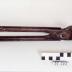 Description : deux branches tubulaires articulées en "X". l'articulation est rivetée et les branches sont montées sur ressort. Cet outil comprend deux mâchoires. La mâchoire inférieure forme une gorge concave légèrement coudée. Elle est entaillée au milieu. La mâchoire supérieure est une pièce de métal sur laquelle est riveté un couteau en croissant. En serrant, les branches, le couteau se loge dans les encoches de la mâchoire inférieure. A la base un anneau en fil de fer permet de maintenir la pince fermée.