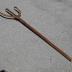 Description : Outil composé d'un bois de section circulaire , central tenant lieu de manche et dont l'extrémité forme la dent médiane de la foruche. Les deux dents latérales sont ajustées au manche au moyen de deux lamelles rivetées. La courbure de la fourche est donnée, à l'extrémité des dents éffilées de section circulaire par trois cornes de chèvre qui ont été enfilées. Ces cornes évitent par ailleurs une trop rapide usure du bois.