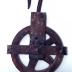 Description : Poulie à gorge (Lg : 3 cm P : 2 cm) à cinq rais à mobilité folle. Les rais sont de section rectangulaire (3 x 1 cm). Une pièce métallique de section rectangulaire (4 x 0,5 cm) l'entoure au médian. Elle est de forme ovale allongée. Un crochet dont l'extrémité inférieure est à tête bombée, a une mobilité folle sur une pièce en "U" qui enfourche la poulie. Un essieu circulaire maintient l'ensemble des pièces en place. La tête est composée d'un boulon à pans. Il est percé à l'autre extrémité. Une goupille métallique est glissée dans ce trou.