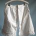 Description : Culotte fendue sur les côtés au niveau de la taille et maintenue fermée par un système de boutonnage. Fendue aussi à l'entrejambe. Deux oeillets au dos de la ceinture permettent le coulissage de lacets plats pour adapter la ceinture aux variations de la taille. Présence d'un volant brodé au point de feston au bas de chaque jambe.Travail fait main et machine.
