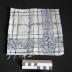 Description : Pièce de tissu carré ourlée sur trois côtés, le quatrième est la lisière. Tissu écru quadrillé en bleu marine et motif floral : guirlandes et bouquets de roses toujours en bleu marine.