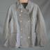 Description : Vêtement à col chemisier, transformable et maintenu ouvert en "V" par deux boutonnières s'adaptant chacune, sur deux boutons cousus sur le devant. Dans le même alignement, quatre boutons de chaque côté se fixent sur quatre boutonnières de chaque côté ; permettant un boutonnage homme ou femme. Une poche plate à gauche et à droite en bas du vêtement. (18 x 17 cm) et une petite sur le haut à gauche (10x10 cm). Les manches longues sont fermées à la base par un bouton. Le poignet comporte un revers qui peut se rabattre. Au dos, le vêtement est cintré. Il n'y a pas de coutures sur les côtés. On observe trois coutures dans le dos.