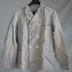 Description : Vêtement à col chemisier, transformable et maintenu ouvert en "V" par deux boutonnières s'adaptant chacune, sur deux boutons cousus sur le devant. Dans le même alignement quatre boutons de chaque côté se fixent sur quatre boutonnières de chaque côté ; permettant un boutonnage homme ou femme. Une poche plate à gauche et à droite en bas du vêtement. (16 x 17 cm) et une petite sur le haut à gauche (13x13 cm). Les manches longues sont fermées à la base par un bouton. Le poignet comporte un revers qui peut se rabattre. Au dos, le vêtement est cintré. Il n'y a pas de coutures sur les côtés. On observe trois coutures dans le dos.