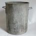Description : Récipient sur plan circulaire à bords hauts et droits, fond renforcé, rebord supérieur renforcé par pliage de la tôle. Présence de deux poignées latérales en tiges métalliques soudées sur le corps du récipient.