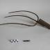 Description : Fourche à trois dents (L : 35,5 cm) légèrement recourbées, douille cylindrique soudée à l'arc sur la fourche.