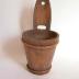 Description : Récipient sur plan circulaire à bords hauts, droits allant en s'évasant constitué de planchettes assemblées comme un tonneau, base circulaire de 1,4 cm de diamètre cerclé en trois endroits par des 1/2 tiges de bois croisées et cloués en place. Une des planchettes dépasse la partie supérieure du seau de 25 cm. Cette planchette comprend un trou circulaire de 2 cm de diamètre pour permettre de suspendre le seau à un clou. Une ouverture lenticulaire (7 x 3 cm) permet de passer la main et de porter le seau.