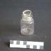 Description : Récipient sur plan circulaire à bords bas et droits, goulot large court avec un renflement.