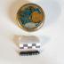 Description : Récipient sur plan circulaire à bords bas et couvercle amovible de 1,3 cm de hauteur métal doré avec des inscriptions (cf ci-dessus)
