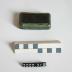 Description : Récipient sur plan rectangulaire à bords bombés courts. Le récipient est constitué de deux parties réunies par une charnière longitudinale. La boîte est peinte en vert. La partie supérieure forme le couvercle. Sur sa face supérieure se trouve une étiquette peinte en noire et portant un écu doré.