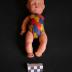 Description : Poupon dont les cheveux sont de la même matière et même couleur que le reste de la tête et du corps. Les yeux bleus aux paupières sans cils se ferment en position horizontale. La bouche est ouverte. Un vêtement en toile plastique est collé sur le tronc.