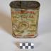 Description : Récipient sur plan ovale à côtés parallèles terminés par deux arcs de cercles. Bords hauts et droits. Fermeture et fond parallèle et plat. L'obturation de la boîte est obtenue par une fine tôle qui glisse sous un coudier. Les deux faces rectangulaires sont colorées en blanc, or, rouge. Elles donnent la marque du produit, la nature, le mode d'emploi. Le tout est en italien. Sur une des faces arrondies : une cartouche de chasse, sur l'autre l'inscription du poids.