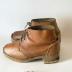 Description : Chaussures en cuir gainées de couleur fauve. Le pied est en trois parties. L'avant, le milieu (rivé et cousu à l'avant), le talon cousu sur le deuxième. Les trois parties en cuir sont clouées sur la semelle. Celle-ci est en bois et son épaisseur est importante (2 cm à la semelle, 4 cm au talon).