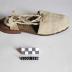 Description : Chaussures d'été en toile tissée composée de la partie avant. Celle-ci est découpée pour laisser sortir l'extrême pointe du pied. Une bande passe derrière le talon. La fermeture est assurée par une corde tressée qui relie les deux parties en toile et enserre la jambe. La semelle est en cuir. Le talon est de faible épaisseur (1,8 cm).