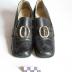 Description : Chaussures de femme à talon mi-hauts (4 cm). Semelles cuir, épaisseur supplémentaire collée aux talons. Dessus en cuir souple marron foncé d'une pièce plate rapportée sur le dessus. Piqûres et perforations fantaisies sur le devant. Boucle dorée et lanière large perforée d'oeillets dorés en travers du coups de pied. Doublure intérieure en peausserie beige clair. Les bouts sont carrés.