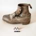 Description : Chaussure montante en cuir marron foncé. Tout l'avant du pied et le bas sont renforcées par une double épaisseur. La couture arrière est recouverte à l'intérieur par une fine languette cousue. A l'extérieur, une languette en cuir recouvre la couture arrière. Présence d'une boucle en cuir pour suspendre la chaussure. Une pièce en cuir cousue au dessus du talon recouvre une déchirure. Forte semelle en cuir. Entièrement cloutée, sur la semelle clous à tête ronde et quelques clous "caboches" (Tête carrée) clous spéciaux en "aile de mouche" à l'avant. Sur le talon, tous les clous sont "caboches". Deux rangs sur le pourtour arrière et latéral. Un rang sur l'avant du talon et un seul clou au centre. Le laçage n'est pas centré mais rapporté sur la gauche de la chaussure en partie par oeillets et le reste par crochets.