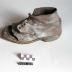 Description : Chaussure montante en cuir épais. Deux parties cousues à mi-pied, laçage par oeillet et crochets talon souligné par double piqûre, Semelle cuir forte épaisseur. Semelle ferrée par des clous à tête ronde, une ferrure en demi-lune à l'avant et des clous en "aile de mouche" sur l'intérieur. Le talon comporte une rangée de clous "caboches" (tête carrée) sur tout le pourtour. Trois clous à tête ronde au centre.